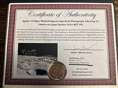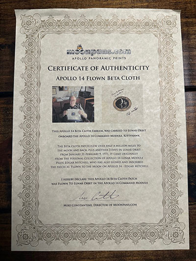 For sale is a flown Apollo 14 Beta cloth patch signed by Edgar Mitchell, inscribed, "Flown to the Moon on Apollo 14". A mint example, with no creases or discoloration. A COA from Moonpans is included, showing Edgar Mitchell holding the beta cloth after signing. Also included is a signed 8 by 10 inch picture of Mitchell on the moon with a COA from Apollo Space. These two items were framed as a pair, but have since been removed for ease of shipping. $3495 for everything with shipping included. PayPal is the preferred method of payment.