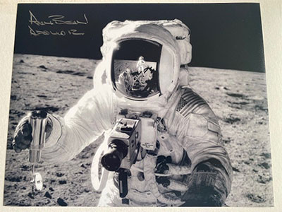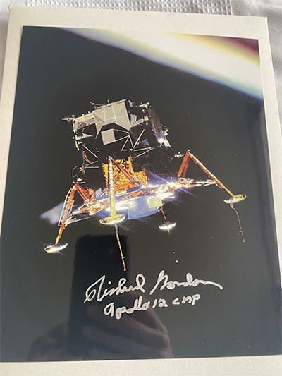 10x8-inch black-and-white photograph depicting an Apollo 12 Astronaut Alan Bean on the lunar surface, holding a sampling instrument with the reflection of fellow crewmate Charles Conrad visible in the visor. Hand-signed in silver ink by astronaut Alan Bean, who has also inscribed "Apollo 12" below his signature. The autograph is crisp, well-placed, and highly legible. Come with Novaspace COA. Asking $225  - Description: Richard Gordon Signed Lunar Module Intrepid in lunar orbit 8x10 photo