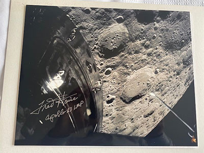 8x10-inch color photograph from the Apollo 12 mission showing the Lunar Module Intrepid in lunar orbit, with space as the backdrop. The photo is hand-signed in silver ink by Command Module Pilot Richard Gordon, who has also inscribed "Apollo 12 CMP" beneath his signature. This signiture was obtained via direct mail in to Dick gordon. Asking $125  - Description: Fred Haise Signed Lunar Module with the Moon's suface 10x8 photo