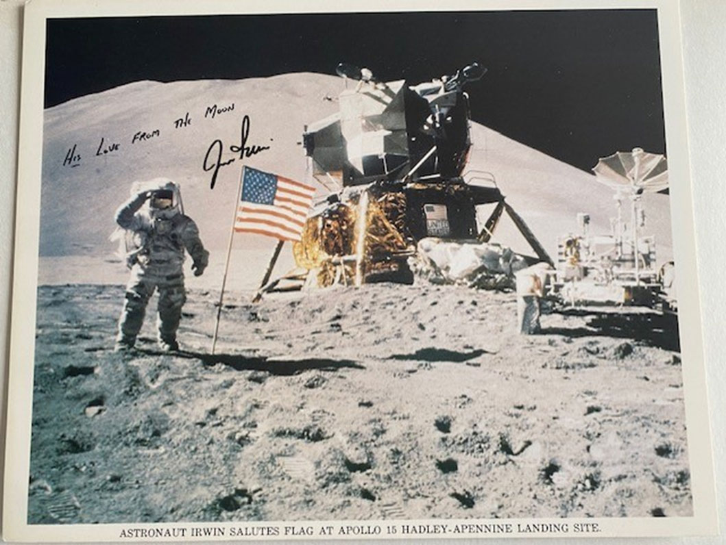 10 x 8 Apollo 13 photograph hand-signed by astronaut Fred Haise, Lunar Module Pilot on the Apollo 13 mission. The image features the Apollo CM in lunar orbit with the Moon's surface visible in the background. The autograph is clearly signed and inscribed "Apollo 13 LMP." The signature was obtained in person at Spacefest 2011, and I have a photograph of Fred Haise signing this item. Asking $300  - Description: Jim Irwin signed 10 x 8 photograph depicting him on the Moon during Apollo 15, with the pre-printed inscription "His Love From The Moon. Obtained via Spaceflori
