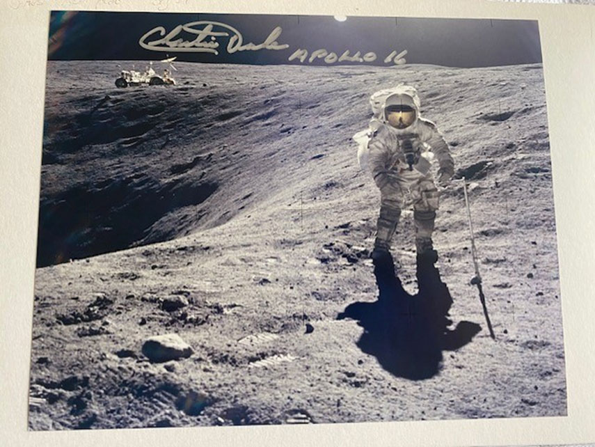 Asking $180  - Description: Charlie Duke hand-signed 10 x 8 photograph depicting him on the Moon's surface beside Plum Crater