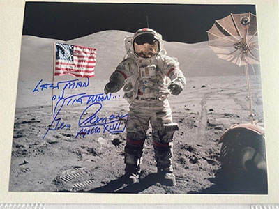 10x8 Apollo 16 photograph hand-signed by astronaut Charlie Duke. The image shows Charlie on the lunar surface beside the Plum crater with the Lunar Roving Vehicle visible in the background. The photograph is clearly signed in silver marker and inscribed "Apollo 16." The autograph is accompanied by an Astronaut Scholarship Foundation (ASF) letter. Asking $130  - Description: Gene Cernan hand-signed 10 x 8 photograph depicting him on the Moon's surface during Apollo 17.