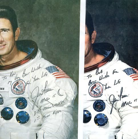Perhaps the availability of undedicated Armstrong lithos can be attributed to people striking while the iron is hot. It wasn't that long ago when I could have purchased one for $2,600. They seem to have drastically shot up since. As for the Irwins, all I can say is he never sent me one. Back when I was writing him twice a year for autographed photos, he always sent me either the flag photo or one of him standing next to the Rover near the LM. At the time, those were the only photos I was interested in getting signed. After all, nothing says "astronaut" like a photo of him standing on the surface of the moon. To be perfectly honest, I still prefer a lunar surface signed photo over a WSS. Maybe I'm just weird, but I would much rather have a photo of an astronaut working in space as opposed to one of him or her posing in front of a camera here on earth. |