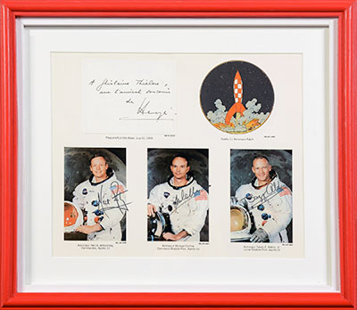 Real or fake Apollo 11 signed item? TINTIN Hergé, signed and dated, APOLLO 11 (Armstrong, Aldrin, Collins)This extremely rare, framed set features a dedication in Hergé's pen and the handwritten signatures of the three astronauts: Neil Armstrong, Buzz Aldrin, and Michael Collins of the Apollo XI program, the only ones to have entered the legend. Hergé's dedication and the astronauts' signatures have been expertly verified, and proof of provenance is included.  |
