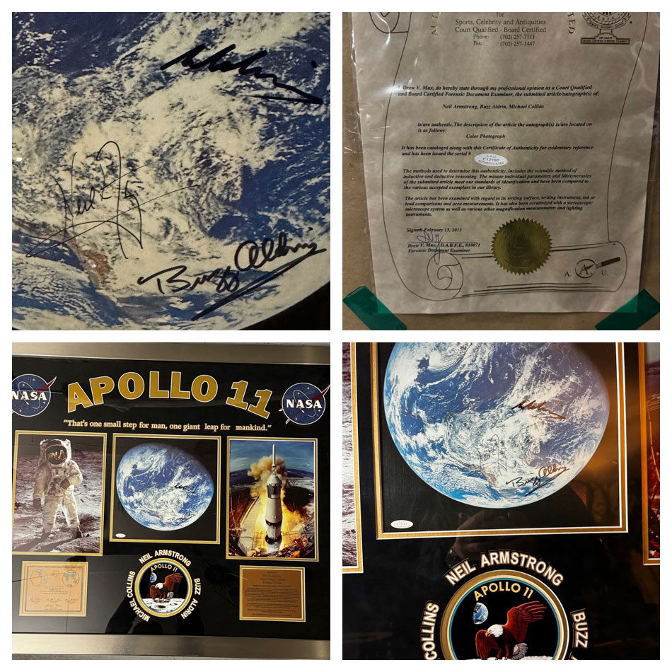 I have an Apollo 11 crew-signed Earth photo displayed in a fairly nice presentation, which came with a COA and letter from Authentic Autographs Unlimited dated 2013. I recently was made aware however it looks like a forgery.  Richard from the Space Collective suggested I send to Steve Zarelli to do a quick email opinion of yes or no if these signatures would pass authentication, and Zarelli said no they would not. So this is really bad news for me, and I just want to back up my findings with any input from those who are familiar with Armstrong, Aldrins and Collins' signatures here, and if these look problematic. Also is Steve Z the gold standard for signatures? He says there are issues then there are issues? I'm also curious if anyone has any info on AAU authentications or Drew V. Max, the one who signed off on the original COA? I believe this was originally purchased by an extremely reputable friend of mine somewhere in San Fransisco by Pier 39 where there used to be a big collectibles shop. Any feedback or second, third opinions will help me swallow this bitter news a little bit easier. Thanks for helping me. |