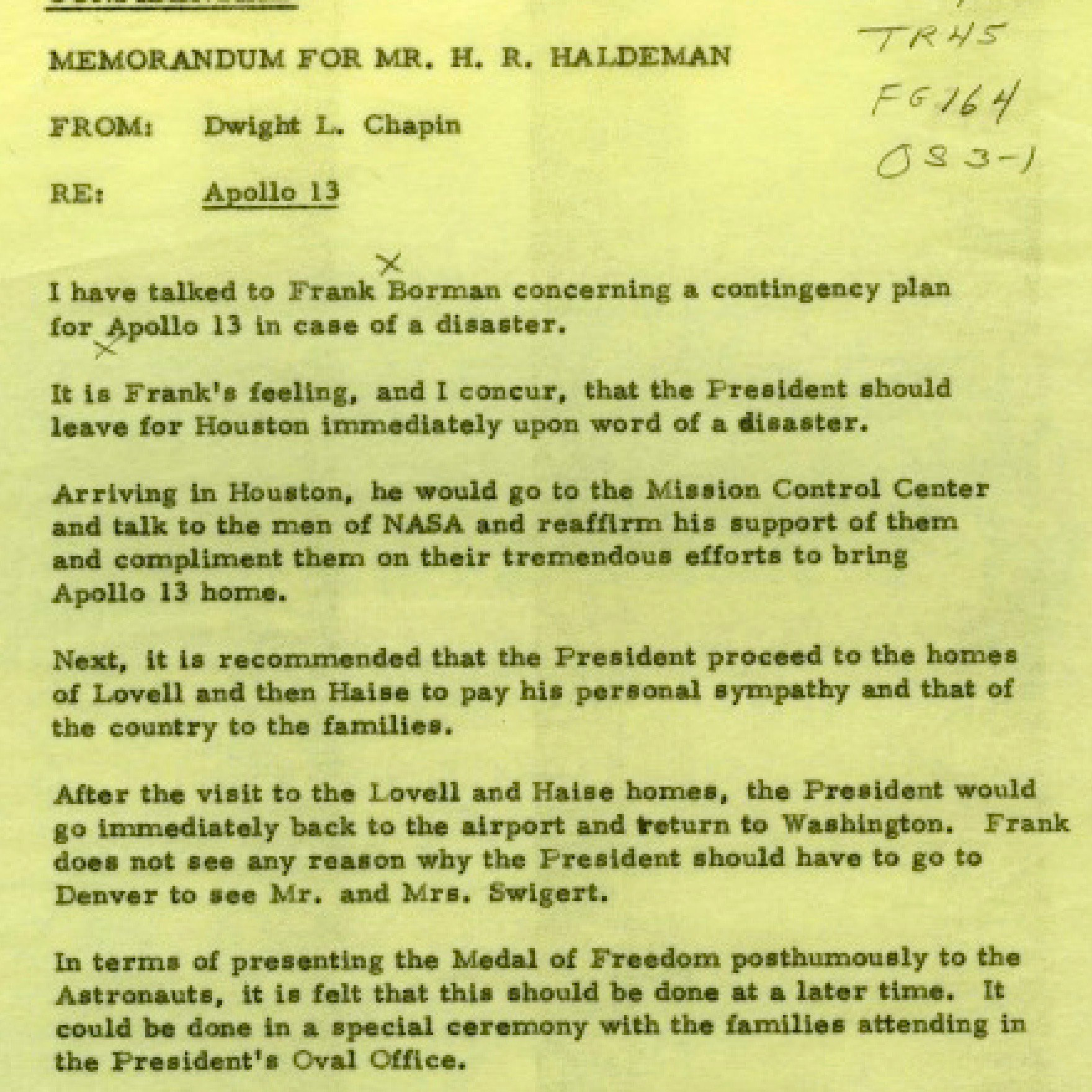 Actually, the memo is pretty apolitical because of the multiple references to Frank Borman's advice.At this time, Dwight Chapin was the "Appointments Secretary" for the President. Of course he would write a memo about Nixon's possible schedule given an Apollo 13 failure, especially given Chapin's reputation as a details guy. While Chapin had a long history with Nixon and worked on his campaign (and other presidential campaigns), this memo is hardly cynical political plotting. It's advance planning — sounding out Frank Borman — in the face of a possible tragedy. |