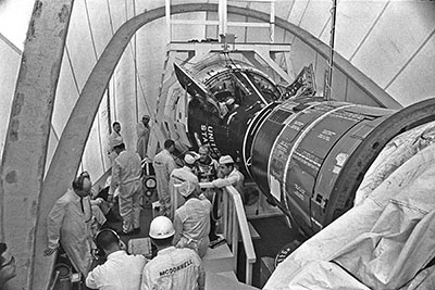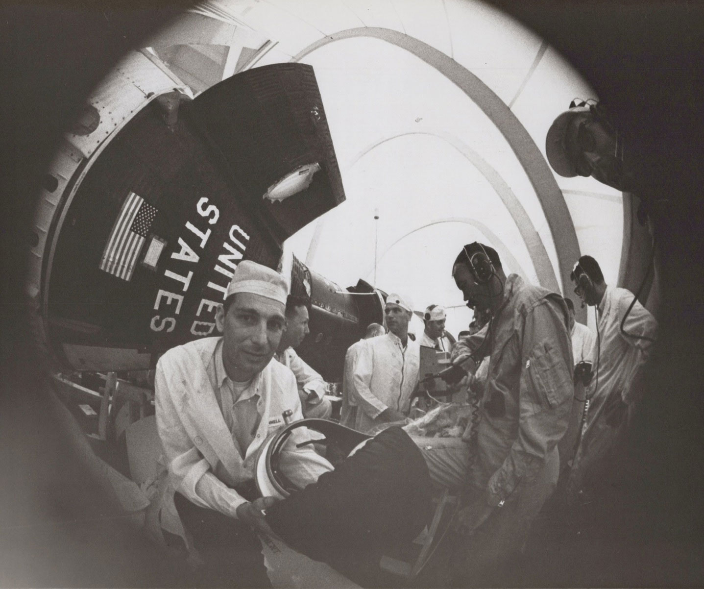 Reminds us a bit of the Gemini X testing when a Gemini capsule was docked with an Agena Target Vehicle in order to get the radar bore sighted.Young and Collins were present as the EVA umbilical cord and chest pack were connected to the spacecraft Environmental Control System.  |