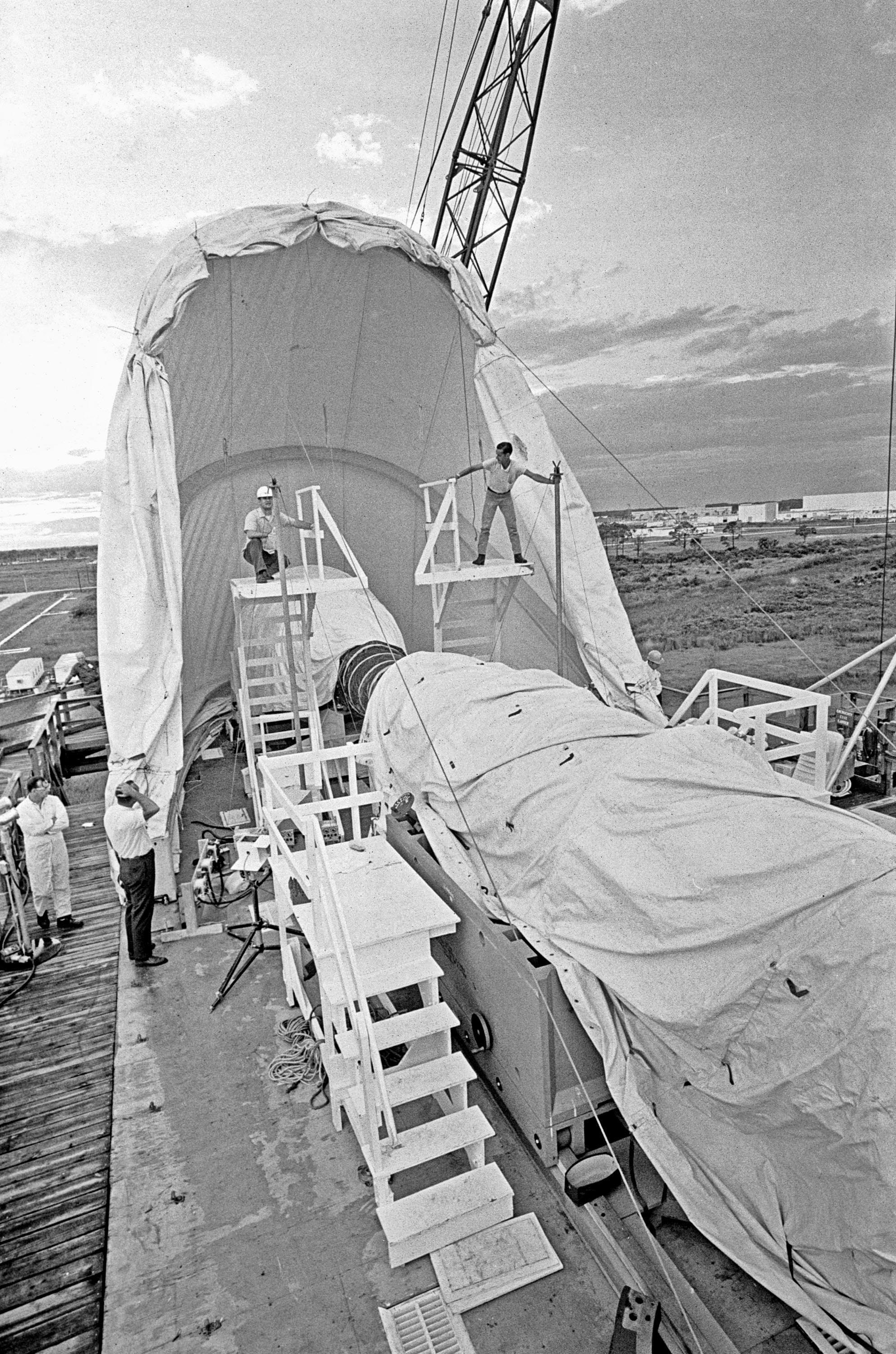 I have a number of photos of the Gemini 12 spacecraft and docking mechanism enclosed in a tent-like structure at Cape Canaveral. Can someone please explain what this structure is and what kind of activities were conducted in it in advance of the flight? The three accompanying photos show the exterior of the structure as seen from the ground, the spacecraft and docking target (an Agena?) being installed in the structure, and an astronaut conversing with McDonnell technicians inside the finished structure. Any help would be appreciated.