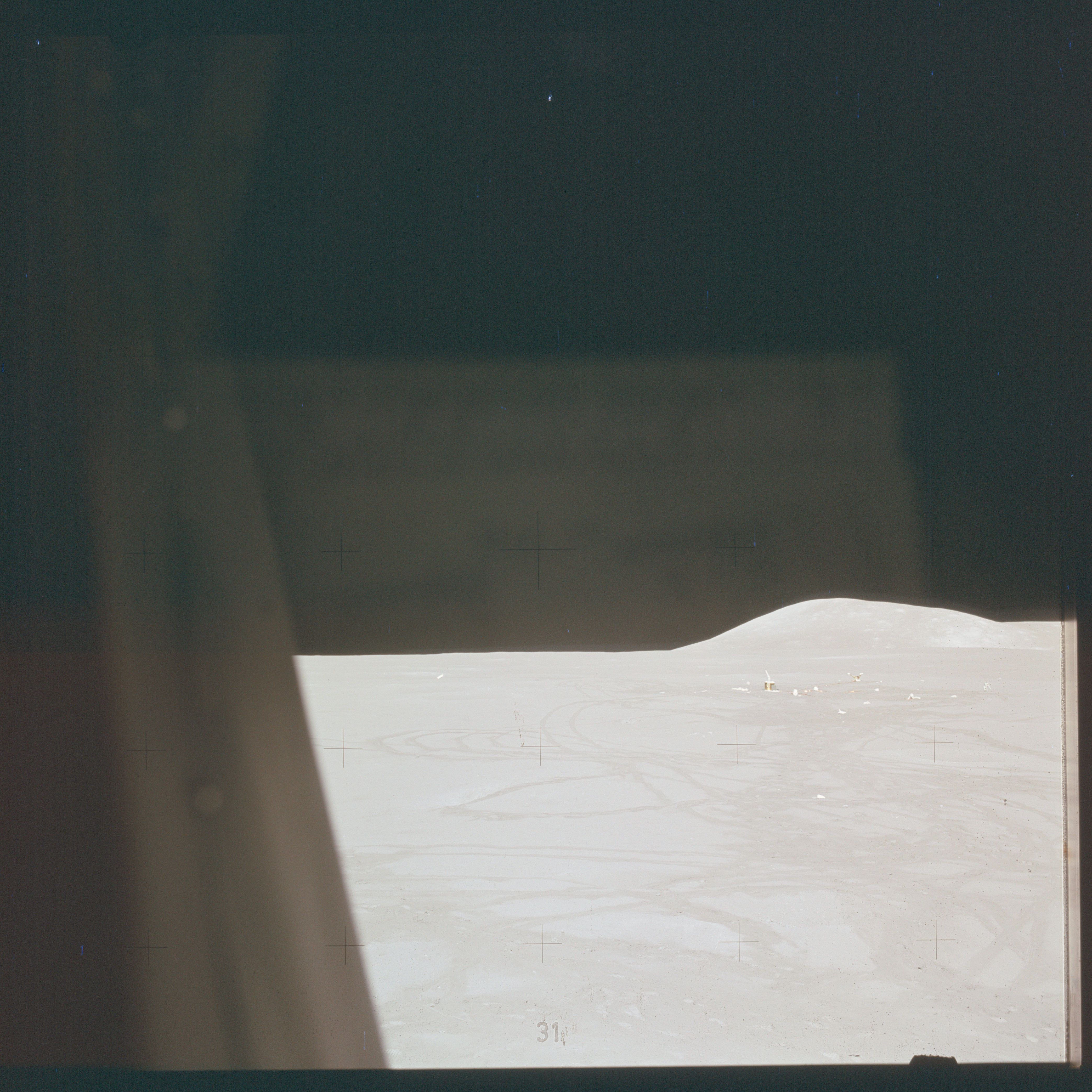 The Apollo Lunar Surface Journal has post EVA-3 photo AS15-88-11954 taken shortly after 169:37:47 GET and a long comm break. David Scott took a left window panorama. Then Jim Irwin took a right window panorama that included frame 11954, the last photo of his pan.The Apollo Flight Journal has the Apollo 15 command module flying overhead at around the same time, with closest approach to the landing site at 169:40:38 GET. Might the bright object seen at top center in photo AS15-88-11954 be the command module Endeavour flying over the Apollo 15 landing site?  |
