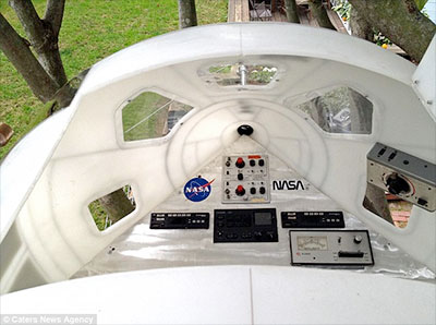 He then decorated the exterior of the capsule with NASA livery and placed it on a platform in a tree.