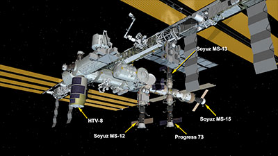 This graphic shows the three Soyuz vehicles docked to the ISS in 2019: Sept. 28, 2019: International Space Station Configuration. Five spaceships are attached to the space station including Japan’s HTV-8 cargo craft with Russia’s Progress 73 resupply ship and Soyuz MS-12, MS-13 and MS-15 crew ships.  |