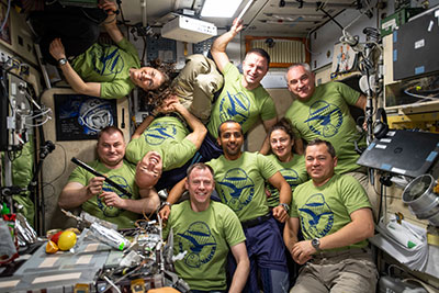 The nine International Space Station residents pose for a portrait inside the Zvezda service module. At the bottom row from left are, station cosmonaut Alexey Ovchinin, astronauts Luca Parmitano and Nick Hague, visiting astronaut Hazzaa Ali Almansoori of the United Arab Emirates, astronaut Jessica Meir and cosmonaut Oleg Skripochka. At the top are, astronauts Christina Koch and Andrew Morgan with cosmonaut Alexander Skvortsov.  |