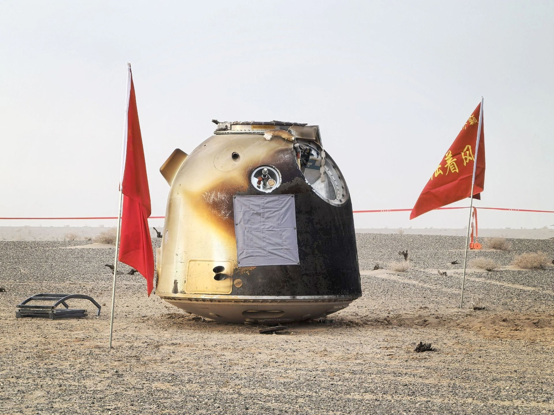 Seen here, the capsule with the cover that the Shenzhou crew installed over the cracked window in view: