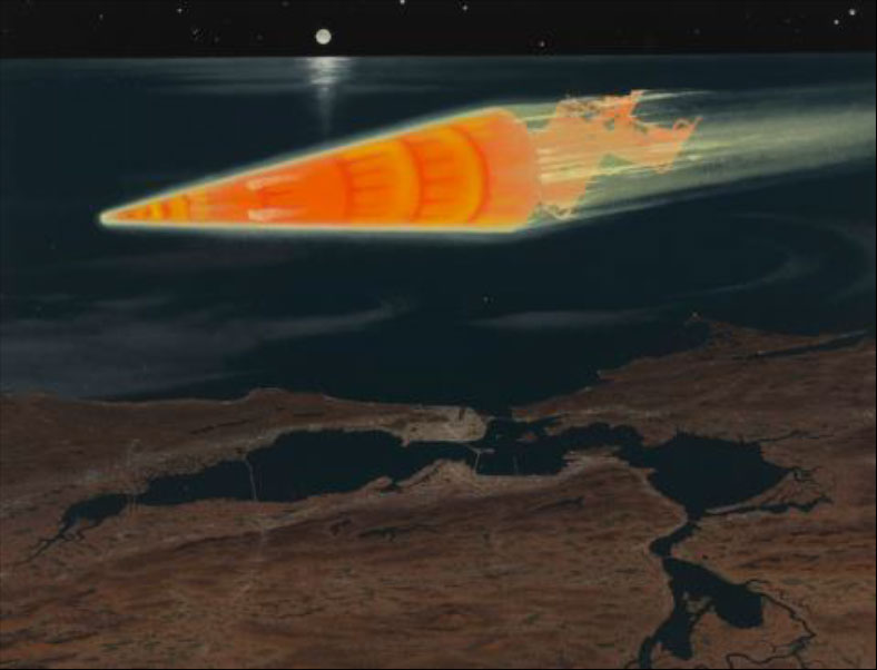 Above: Chesley Bonestell (1888-1986) "Reentry of the Baby Space Station" signed Chesley Bonestell, lower left; oil on board, 16 x 21 in (40.6 x 53.3 cm.), Executed circa 1953. Estimate: $30,000-50,000