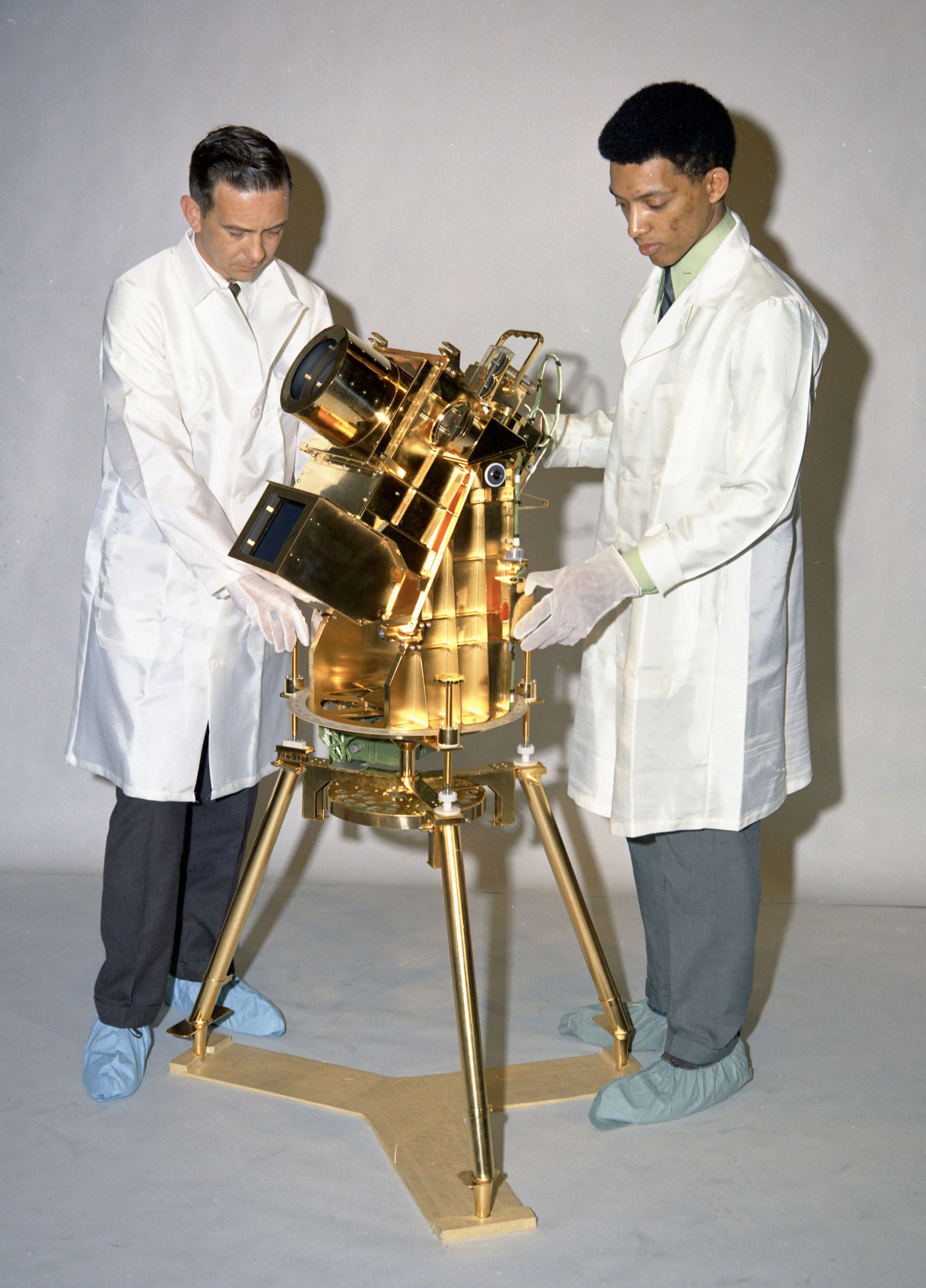 Dr. George Carruthers, who invented the first moon-based observatory, the Far Ultraviolet Camera/Spectrograph (UVC) deployed on Apollo 16, died on Saturday, Dec. 26, 2020, according to the National Society of Black Physicists. He was 81. Dr. Carruthers' UV telescope was used during a 1970 rocket flight, which helped to provide proof of the existence of molecular hydrogen in interstellar space. In 1972, the telescope was used during the first lunar walk of the Apollo 16 mission and for the first time, scientists could examine the Earth's atmosphere for concentrations of pollutants, and see UV images of more than 550 stars, nebulae and galaxies. In the 1980's one of his inventions captured a UV image of Halley's Comet. In 1991, he invented a camera that was used in the space shuttle mission [STS-39].  Above: Dr. George Carruthers, right, and William Conway, a project manager at the Naval Research Institute, examine the gold-plated ultraviolet camera/spectrograph, the first moon-based observatory that Carruthers developed for the Apollo 16 mission. |
