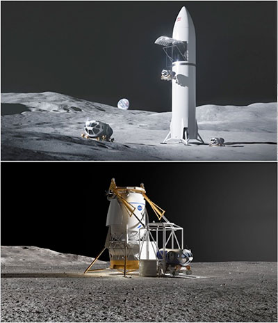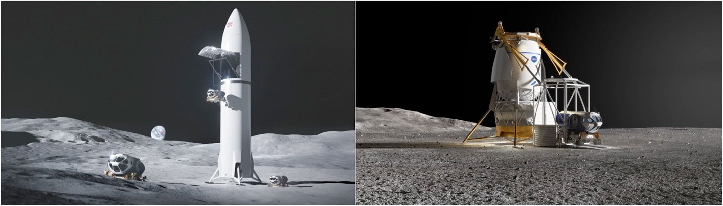 Above: Early conceptual renderings of cargo variants of human lunar landing systems from NASA's providers SpaceX, left, and Blue Origin, right. The large cargo landers will have the capability to land approximately 26,000 to 33,000 pounds (12-15 metric tons) of large, heavy payload on the lunar surface. (SpaceX/Blue Origin)