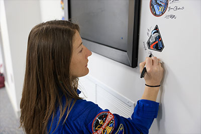Bob, Christina Koch's autograph can be found just about in the middle of the flown cover.See photo above of Jeremy Hansen signing the patch wall at the Operations and Checkout Building at the Kennedy Space Center. Christina's signature is just below her name on the Artemis II patch. |