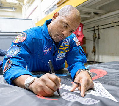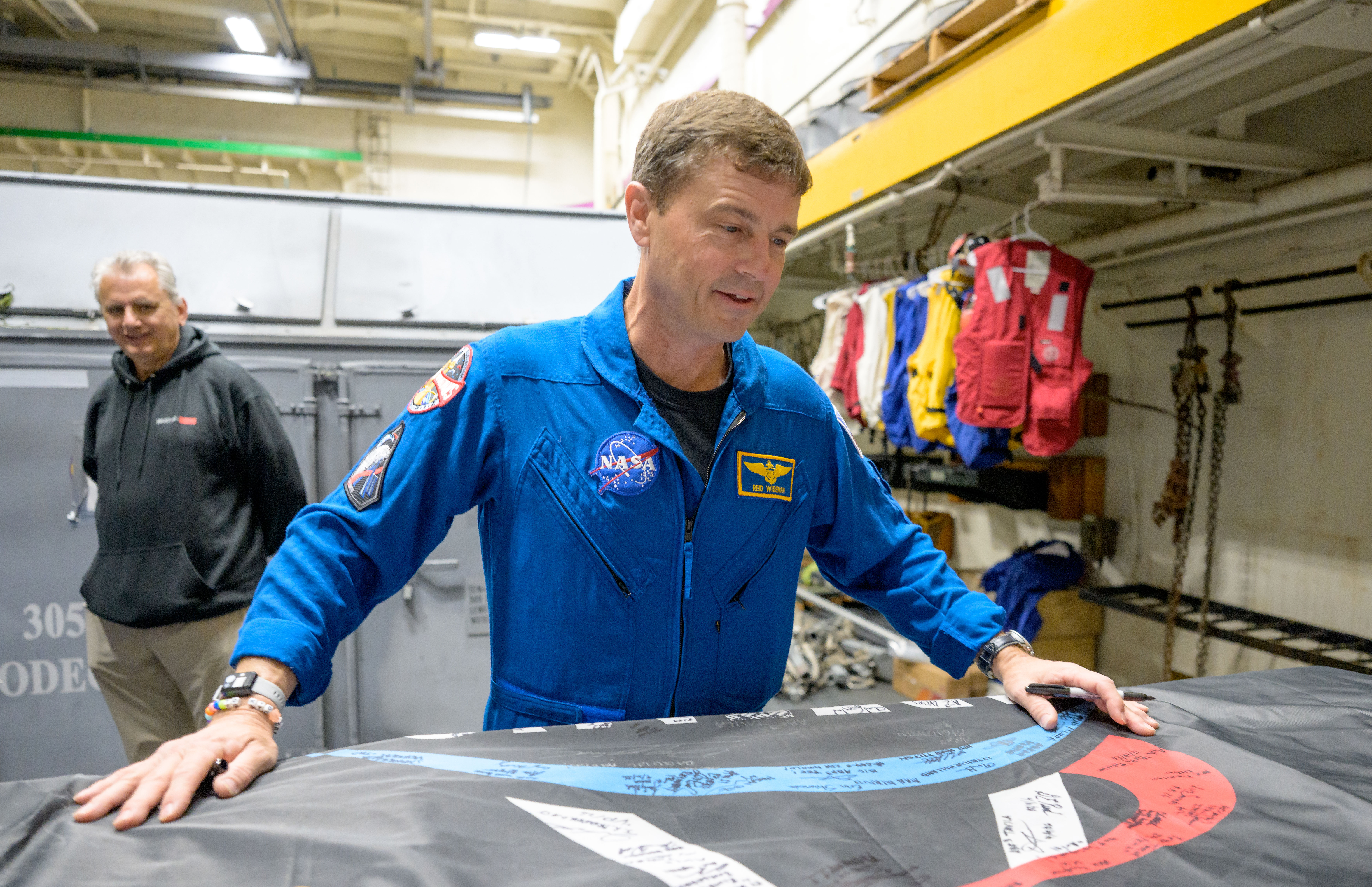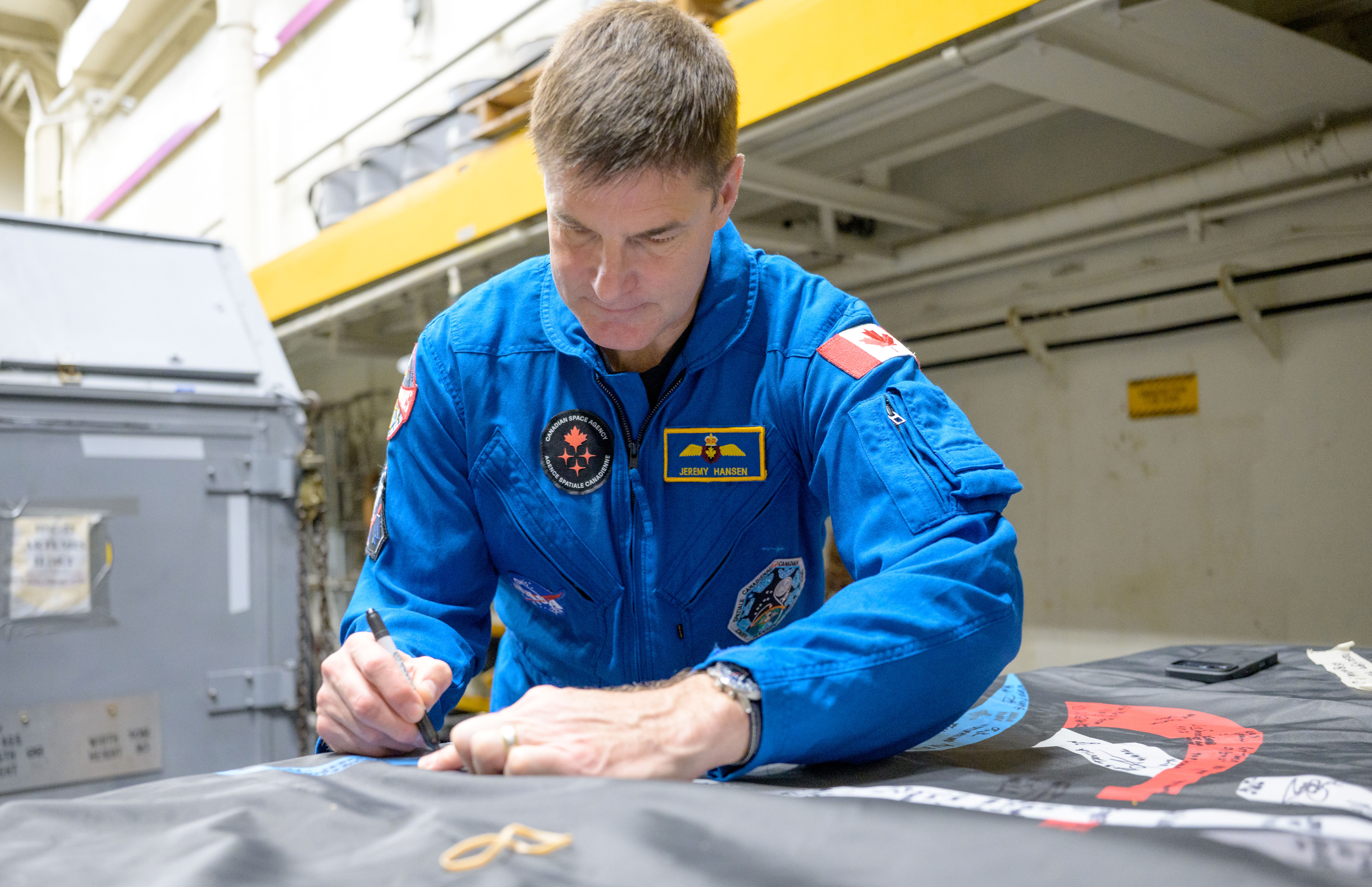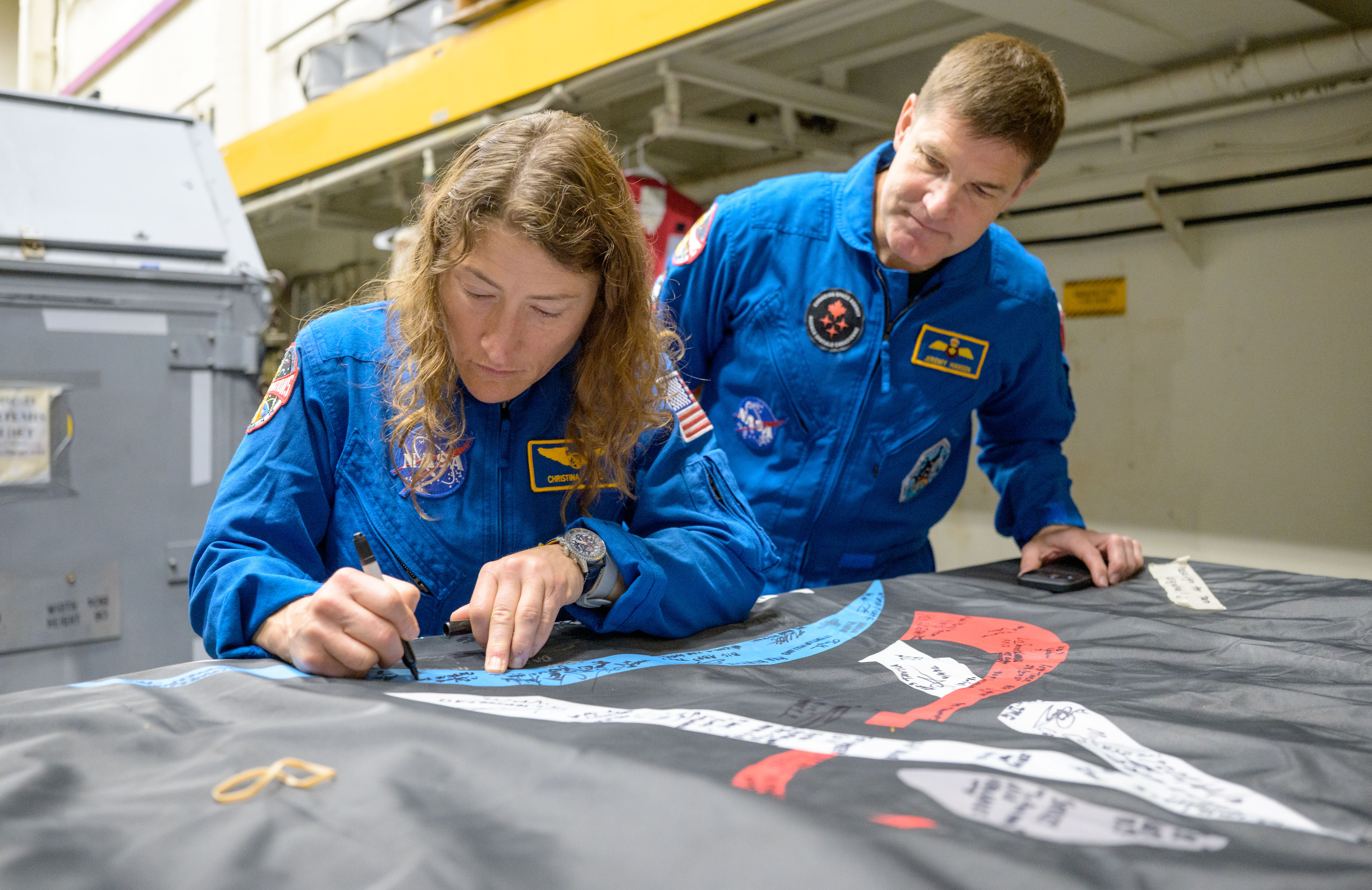 The Artemis II crew signs their mission flag on board USS John P. Murtha.Photos credit: NASA/Bill Ingalls.