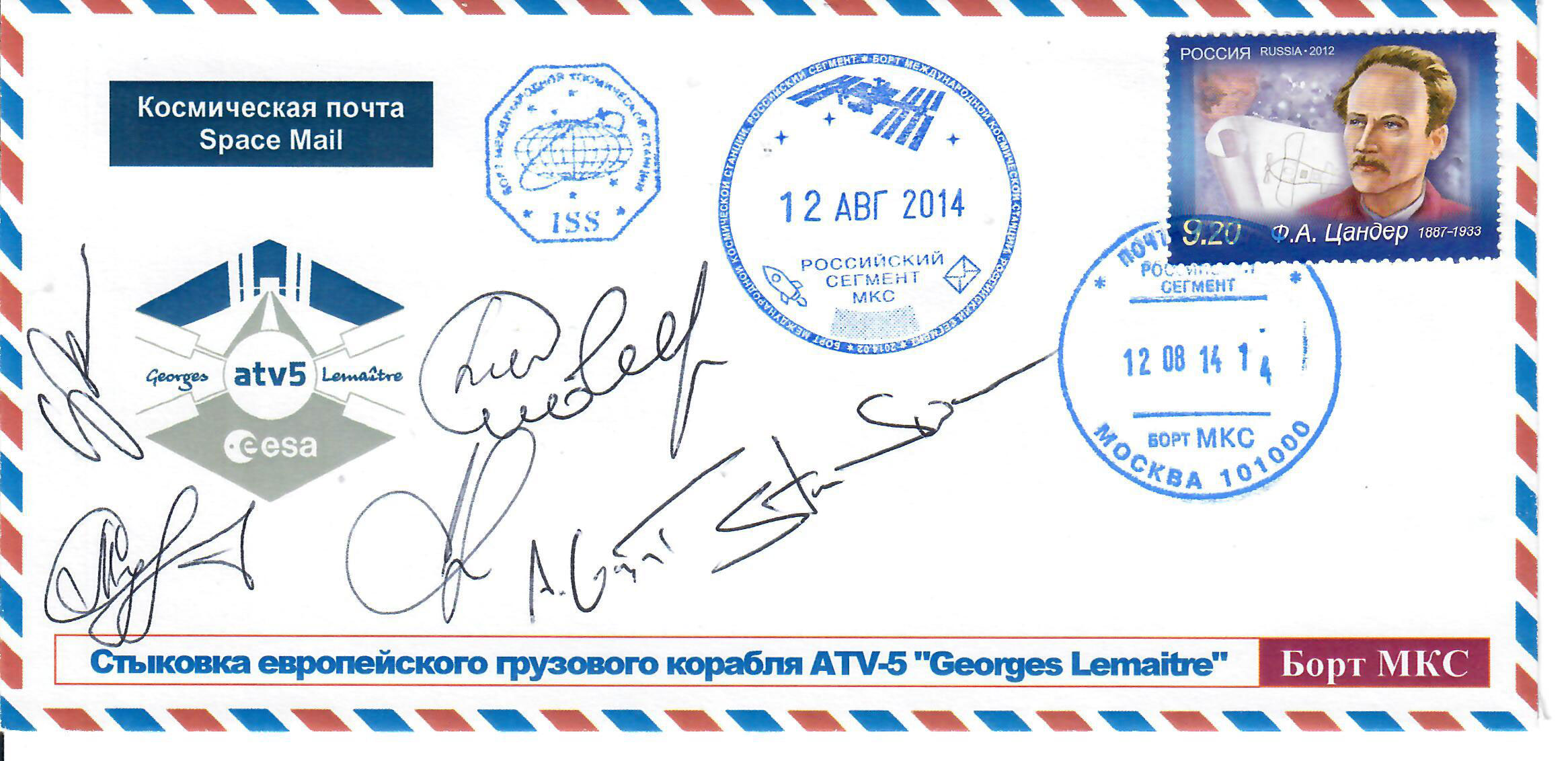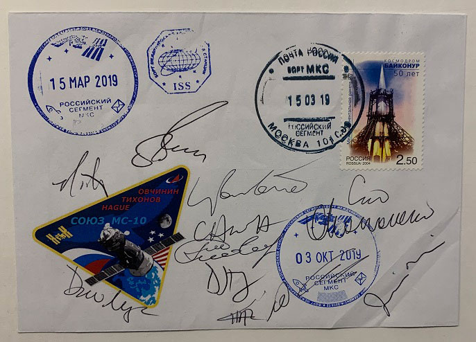 Tom, your cover was flown twice. It was inside the Soyuz MS-10 orbital section, when it crashed to Earth without parachute from a height of 50 km. These covers are the only crash mail from a manned space flight. |