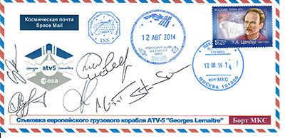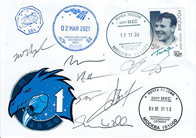 The crew patch on Tom's cover is its original version. It includes Nikolai Tikhonov who was assigned as third crew member. During a walk in the evening one of his eyes was hit and injured by a branch. He retired from the Cosmonaut Corp in 2020 without having been in space. Here are two more covers which were signed in space by one member of the Artemis II crew: Reid Wiseman signed the ATV-5 cover and Victor Glover the Dragon Crew-1 cover during his first space mission.